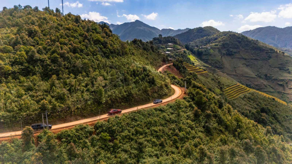 Từ thị trấn Mù Cang Chải đi ngược về phía đèo Khau Phạ, đoàn BMW - Một vòng Việt Nam chúng tôi rẽ theo đường Nậm Khắt để đến với Ngọc Chiến trên cung đường khoảng 40 cây số nhưng toàn địa hình đèo, núi. Đây là điều kiện lý tưởng để “bộ đôi” BMW X6 xDrive 40i M Sport và BMW X7 M Sport “phô diễn” khả năng vận hành ưu việt.