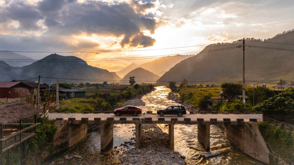 Bộ đôi X6 và X7 đưa đoàn chúng tôi vào bản Lướt. Trong lúc mọi người nhận phòng nghỉ ngơi ở nhà sàn và tắm nước nóng thì tôi chọn cách lang thang tìm hiểu về Ngọc Chiến, chọn một góc thất đẹp ngắm nhìn về Bản Lướt, chụp cảnh hoàng hôn buông xuống.